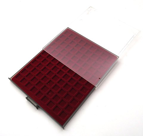Lindner System møntboks med bordeaux rød bakke med 99 fag til mønter eller medaljer m.v. med en diameter på op til 17 mm.