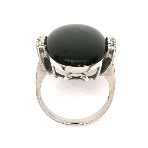 Ring af 14 kt. hvidguld, prydet med stor, oval cabochonsleben onyx, flankeret af 6 diamanter på tilsammen ca. 0,09 ct. Ring Str. 52, samlet vægt ca. 7,2 gr.