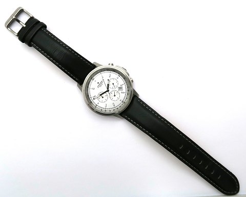 Junghans Chronograph herrearmbåndsur, ref. nr. 41/3210 i urkasse af stål. Aluminiums farvet skive bag safirglas med stregindikation, central og separat sekundviser, datovisning i #4½ position og chronograph funktion. Quartzværk. Urkasse diameter 41 mm. Læderrem med metalspænde. Uret fremstår velholdt.