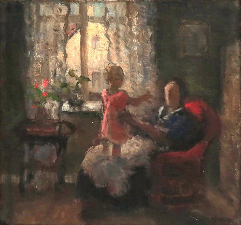 Emiel Hansen (1878 - 1952), signeret oliemaleri på plade med mor og barn motiv. 35 x 33 cm.
