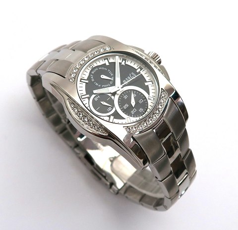 Mango damearmbåndsur, prydet med facetslebne sten, ref. nr. A64124-1SS1 i urkasse og med foldelænke af stål. Sort skive med stregindikation, central sekundviser, 12/24 timer visning samt separat dag/dato visning. Quartzværk, urkasse diameter 36 mm.