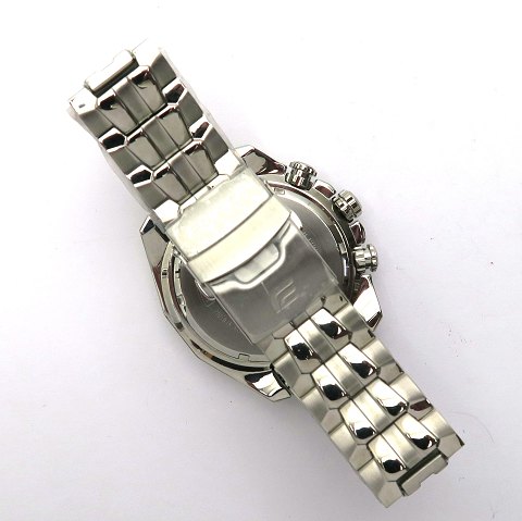 Sort med selvlysende mærker indeksmarkeringer, selvlysende visere. Tachometer, Kronograf, dag og dato. Quartz værk.
