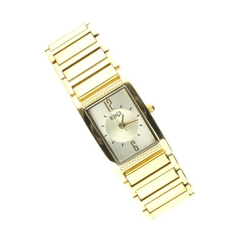 Dameur i firkantet urkasse. Urkasse og lænke guldtonet. Kvarts urværk.