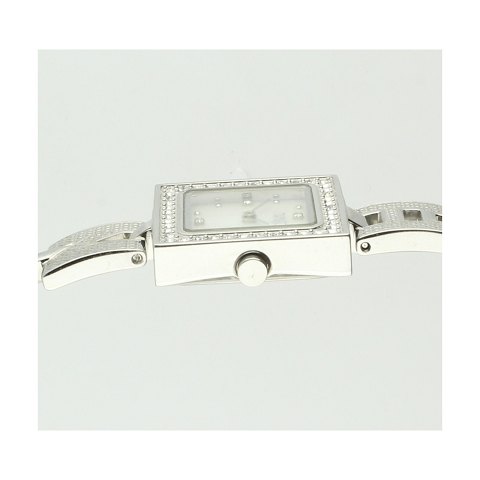 Dameur i firkantet urkasse Indrammet med similisten Urkasse og lænke i rustfri stål. En del af armlænken består af bogstaverne MANGO. Kvarts urværk.