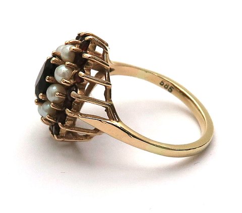 Ring af 14 kt guld med granater og perler