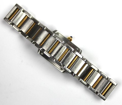 Cartier Tank Francaise damearmbåndsur ref. nr. W51007Q4 i rektangulær urkasse af stål med krone af guld. Hvid skive med romertal. Quartsværk. Lænke af guld/stål. Urkasse 20 x 27 cm.