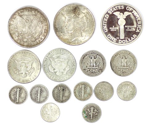 One Dollar 1921 og 1922 sølv, samt 1989S sølv "jubilæumsmønt for Kogressen 20 år 1789 - 1989", Half Dollar 1964 og 1967sølv Quarter Dpllar 1934 og 1958D sølv, One Dime 1942, 1943S, 1944, 1945, 1947D, 1960D, 1964 og 1964D sølv.