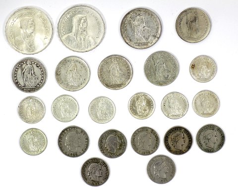 Lot bestående af 2x 5 Franken 1954 sølv, 2 Franken 1944 sølv, 1 Franken 1932, 1934, 1944, 1945, 1946 sølv, ½ Franken 1916, 1934, 1939, 2x 1958, 1963, 2x 1964 sølv. 20 Rappen 1884 Cn, 10 Rappen 1884, 1902, 1906, 1911, 1920, 1929 Cn.