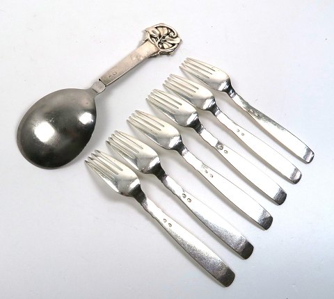 Lot bestående af 6 lotus frokostgafler af sølv, L. 16,5 cm. fremstillet af W&S.Sørensen samt grødske med skaft af sølv, dekoreret med gennembrudt bladværk. L. 21 cm. Lotus gaflerne vejer ca. 230 gr.