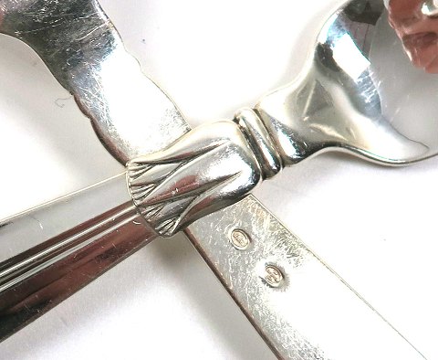Lot bestående af 6 lotus frokostgafler af sølv, L. 16,5 cm. fremstillet af W&S.Sørensen samt grødske med skaft af sølv, dekoreret med gennembrudt bladværk. L. 21 cm. Lotus gaflerne vejer ca. 230 gr.