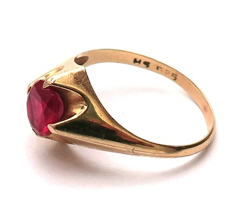 Ring af 14 kt. guld, prydet med rund, facetsleben rubinrød sten