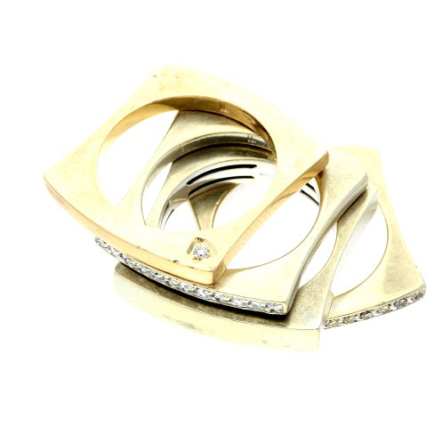 Ring af 18 kt guld bestående af 4 individuelle ringe i forskellige farver guld, som hver i sær kan bæres alene eller kombineres som ønsket.