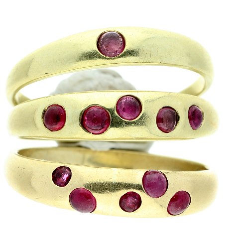 Ring af 14 kt. guld bestående af tre individuelle ringe som kan sættes som ønskes. Hver ring er prydet med røde sten.