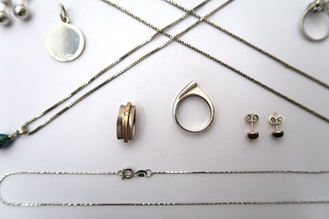 Lot bestående af to halskæder med vedhæng, enkelt halskæde, to par ørestikker to ringe og ter vedhæng. Samlet vægt ca. 37 gr.