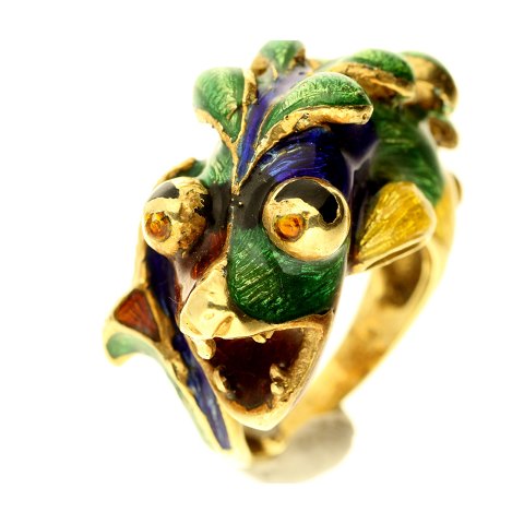 Ring af 18 kt. guld med emaljefisk i forskellige farver.