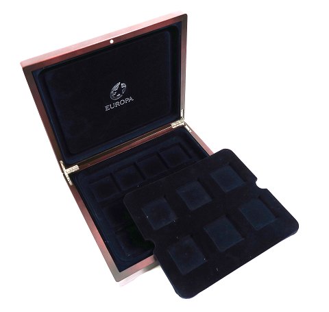 Kasse i træ imitat, indeholdende to fag til 18 emner med en diameter på 50 mm.