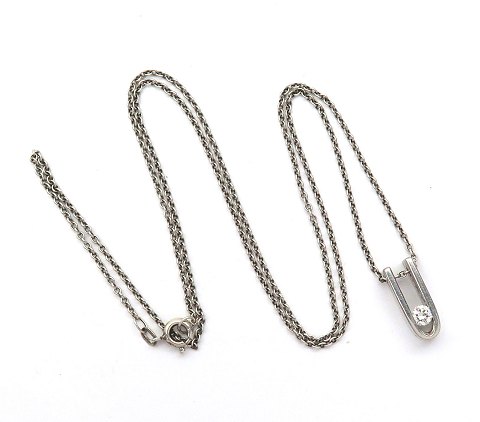 Halssmykke i form af halskæde og vedhæng af 14 kt. hvidguld, prydet med brillant på ca. 0,16 ct. Kæde L. 52 cm., vedhæng L. 16 mm. Samlet vægt ca. 5 gr.