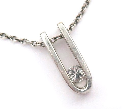 Halssmykke i form af halskæde og vedhæng af 14 kt. hvidguld, prydet med brillant på ca. 0,16 ct. Kæde L. 52 cm., vedhæng L. 16 mm. Samlet vægt ca. 5 gr.