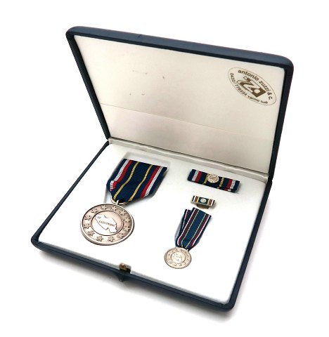 EC medalje og miniature af sterling sølv, begge med sildebånd, indstiftet af EC for indsats i de fredsbevarende styrker. Diameter henholdsvis 36 mm. og 17 mm., samlet vægt ca. 32 gr.