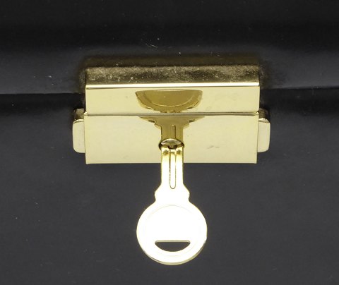Smykkeskrin m/ nøglelås - Et smykkeskrin i imiteret læder med metalspænde, fem skuffer, en lille ekstra aftagelig smykkeboks og spejl. Rummeligt smykkeskrin, med plads til masser af smykker og småting. Nøglelås samt diverse simili smykker er inkluderede.