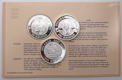 2 stk. 100 kr. 2007 finsølv *Isbjørn* og 2008 finsølv *Sirius*. Præget i anledning af det internationale polarår 2007-2009. Indeholder hver 1 ounce finsølv. Opbevaringsæsker medfølger. 10 kr. 2005 finsølv med motiv fra *Den Grimme Ælling*. Præget i anledning af 200 året for H.C. Andersens fødsel. 1 ounce finsølv, monteret i Nordfrim samlerdisplay.