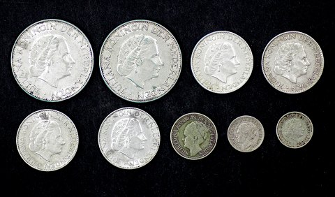 2 ½ Gulden 1961 og 1962 sølv, 1 Gulden 1958, 1964 og 2x 1965 sølv, ¼ Gulden 1947 sølv, 10 Cent 1938 sølv samt 1/10 Gulden 1956 sølv..