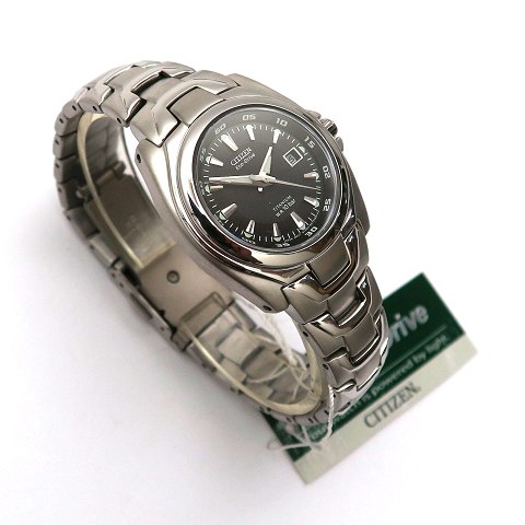 Citizen Eco Drive damearmbåndsur, ref. nr. EW0910-52E i urkasse og med foldelænke af stål. Sort struktureret skive bag mineralglas med stregindikation, central sekundviser og datovisning i #3 position. Eco Drive Quartzværk med lysgenopladelig batteri. Urkasse diameter 32 mm. Brugsmanual medfølger.