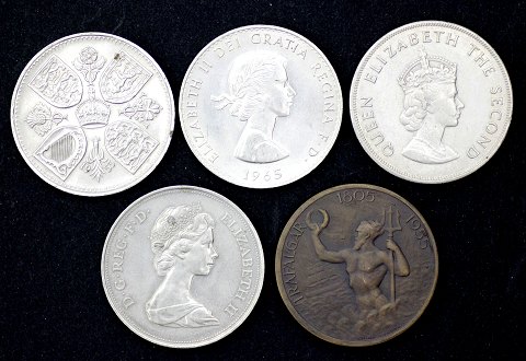 Lot bestående af Five Shillings 1953, Mønt med Sir Winston Churchill 1965, Five Shillings 1966, Mønt 20 november 1972 samt bronze medalje Trafalgar 1805 – 1955 / Admiral Lord Nelson 1758 – 1805.