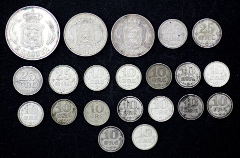 Samling bestående af 2 kr. 1916 sølv, 1 kr. 1915 og 1916 sølv, 25 øre 2x 1918 og 2x 1919 sølv samt 10 øre 2x 1914, 1916, 4x 1918 og 7x 1919 alle sølv.
