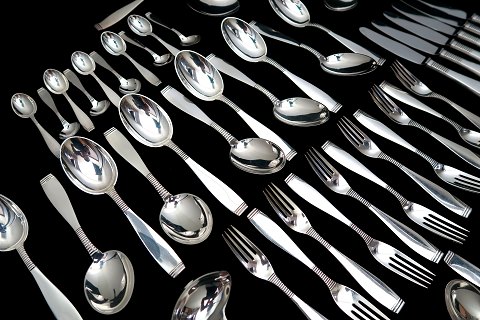 72 dele A.F. Rasmussen bestik af sterling sølv, bestående af 12 middagsskeer, 11 middagsgafler, 12 middagsknive, 12 frokostskeer, 11 frokostgafler, 10 kaffeskeer, stegegaffel, kartoffelske, grødske samt sauceske. Sølvvægt uden knivene ca. 2850 gr.