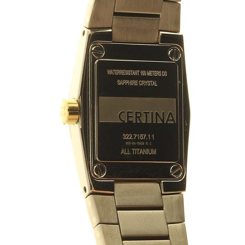 Fint kvalitets dameur fra Certina - swiss made. Urkasse samt lænke af titanium, til dels matteret og med guldfarvede indsatser. Safir krystal glas. Hvid struktureret urskive med guldfarvede arabertal/stregindex. Vandtæt.