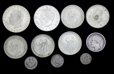 Samling svenske mønter af sølv, bestående af 10 Öre 1876 (korroderet), 25 Öre 1907 og 1947, 1 kr. 1875, 2 kr. 1942, 1944, 1945 og 2x 1950 samt 5 kr. 1952 og 1954.
