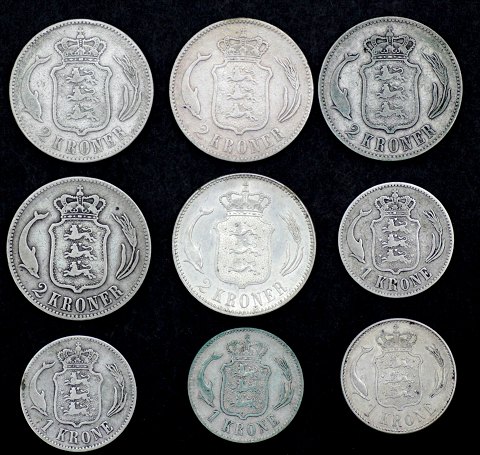 Christian IX / Christian X, 1 og 2 kr. 1875 ~ 1915 sølv (9)