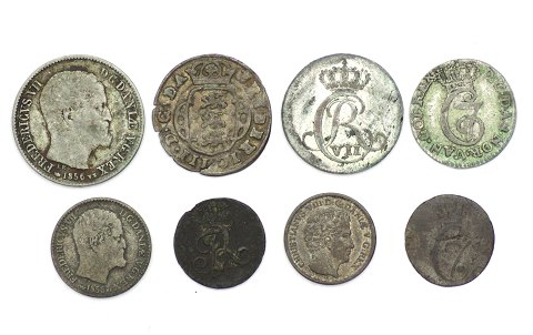 Lot bestående af II Skilling 1663 sølv, I Skilling 1779 sølv, 2 Skilling 1785 sølv, 4 Skilling 1807 sølv, I Skilling 1809 sølv, 3 Rigsbankskilling 1842 sølv, samt 4 Skilling RM 1856.