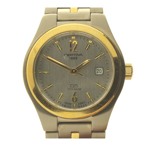 Klassisk Certina dameur - swiss made. Urkasse samt lænke af matteret rustfri stål, med guldfarvede elementer, guldfarvet lynette og safirglas. Metalfarvet urskive med arabertal/stregindex, centreret sekundviser og dato i #3 position. Vandtæt.