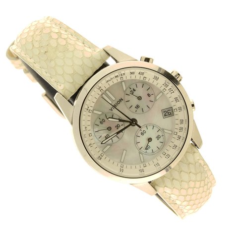 Vision tachymeter dameur, urkasse i rustfri stål. Urskive i perlemor optik med stregindex. Central,- og separat placeret sekundviser. Dato i #4 position. Vandfast.