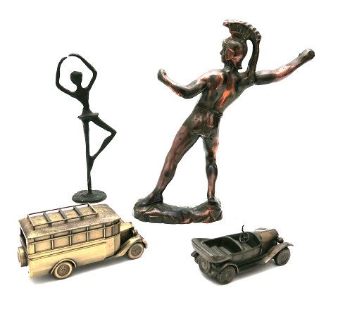 Lot bestående af romersk gladitor af kobberpatineret tin (mangler spyd), ballerina af støbejern, Volvo bus og Volvo Old Timer. H. på figurene henholdsvis 32 og 5 cm.