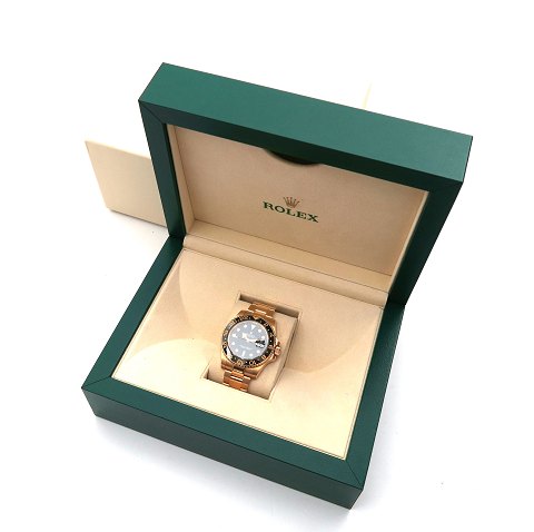 Rolex GMT Master II herrearmbåndsur, ref. nr. 116718LN i urkasse og med foldelænke af 18 kt. guld. Sort skive bag mineralglas med punktindikation, central sekudviser og datovisning i #3 position. Automatisk værk kaliber 3186. Urkasse diameter 40 mm.