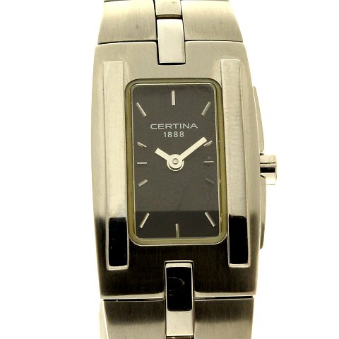 Certina dameur - swiss made. Urkasse samt lænke af matteret rustfri stål, med accenter af blank stål og en fin mat guldfarvet rand om urskiven, safirglas. Sort urskive med stregindex. Uret er vandtæt.