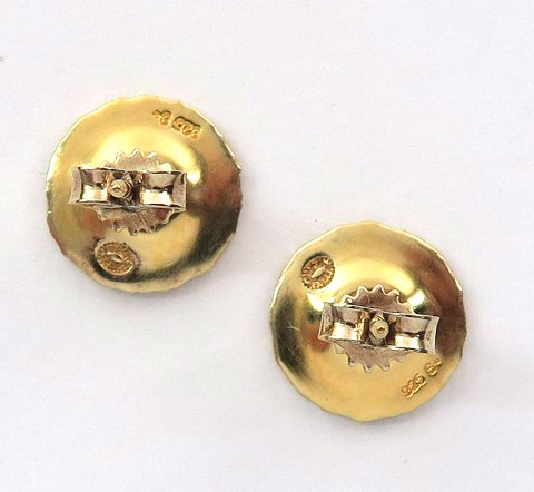 Georg Jensen, par ørestikker af forgyldt sterling sølv med emaljebelagt front, diameter 12 mm. Georg Jensen Sølvsmedje - København.