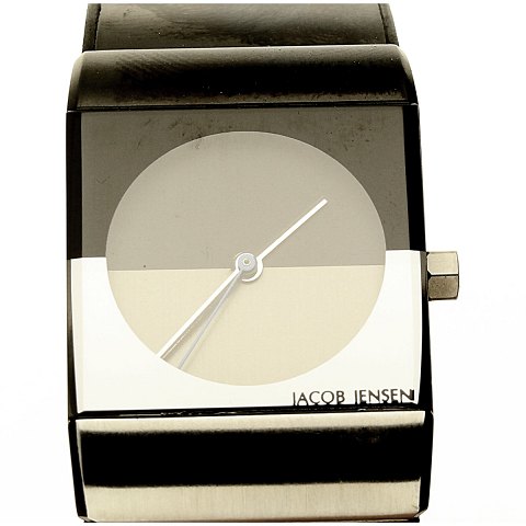Tofarvet Jacob Jensen quartz dame armbåndsur af rustfri stål. Urkassen er matteret sort med safir glas. Urskiven er tofarvet sort/stål med blanke stål visere, centralt placeret blå sekundviser.