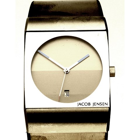 Jacob Jensen quartz dame armbåndsur af rustfri stål. Urkassen er matteret stål med safir glas. Urskiven er tofarvet matteret stål/beige med blanke stål visere, centralt placeret sekundviser og dato i #6 position.