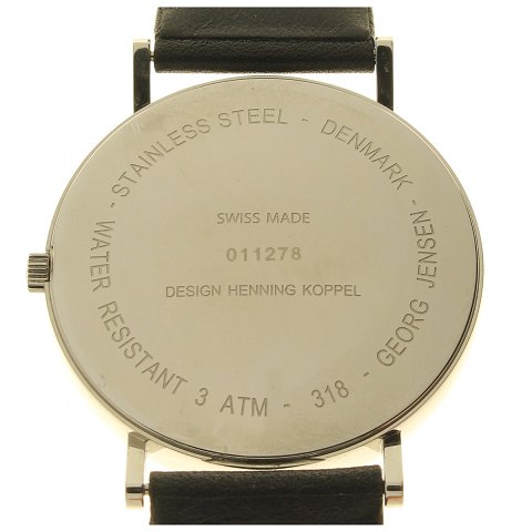 Smukt, tidsløst, swiss made Georg Jensen kvalitets armbåndsur, designet af Henning Koppel. Urkasse af blank poleret rustfri stål. Sort urskive med talindex, centralt placeret sekundviser, datovisning i #6 position. Ø: ca. 38 mm. Vandtæt. Læder urrem.