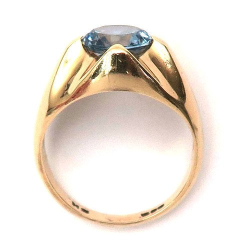 Ring af 14 kt. guld, prydet med aquamarinfarvet, facetteret sten, diameter 8 mm. Ring Str. 54½, samlet vægt ca. 4,5 gr.