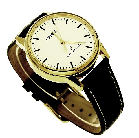 Analog, quartz, radiostyreret Kienzle herreur af guldtonet rustfrit stål med blank poleret urkasse. Hvid urskive med talindikation og central sekundviser. Uret er vandtæt. Sort præget læderarmbånd.