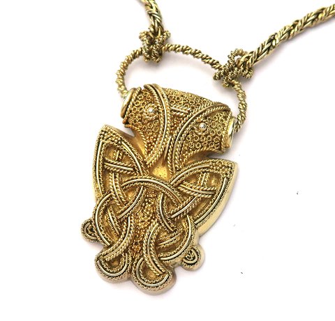 Halskæde og vedhæng af forgyldt sterling sølv. Vedhæng i form af keltisk ugle, L. 55 mm., kæde L. 55 cm. Design: Magnus Knudsen - Maribo