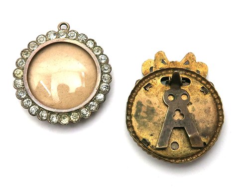 To antikke medaljoner af forgyldt metal, begge med fotografier af personer. Det ene medaljon er et dobbelt medaljon med krans af facetslebne sten, det andet medaljon er med bagstøtte. Begge er fra skønvirke tiden.