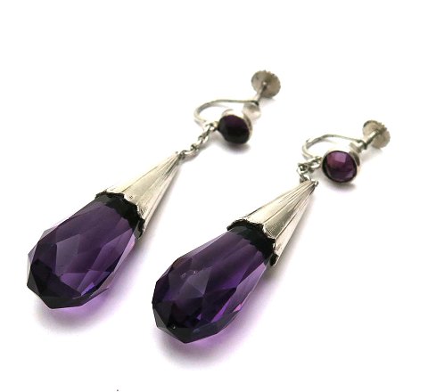 Par øreskruer af sølv, prydet med facetslebne, dråbeformede ametyster, skruer ligeledes prydet med facetslebne ametyster. L. 55 mm. 20. årh. begyndelse.