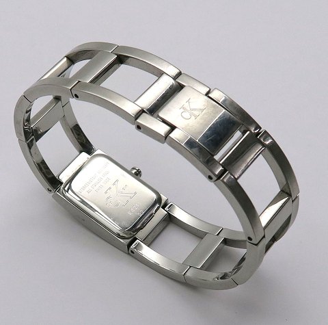 Calvin Klein damearmbåndsur, ref. nr. K 4211 i rektangulær urkasse og med foldelænke af blankpoleret stål. Sort skive bag mineralglas med 3-6-9-12 stregindikation. Quartzværk. Urkasse 17 x 25 mm.