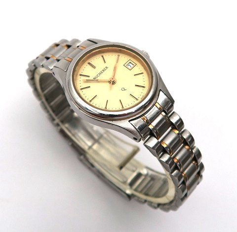 Bucherer damearmbåndsur, ref. nr. 7.183..0.083 i ur kasse af stål med forgyldt krans og foldelænke af stål med delvist forgyldte mellemled. Champagnefarvet skive bag mineralglas med stregindikation, central sekundviser og datovisning i #3 position. Quarzværk. Urkasse diameter 24 mm.